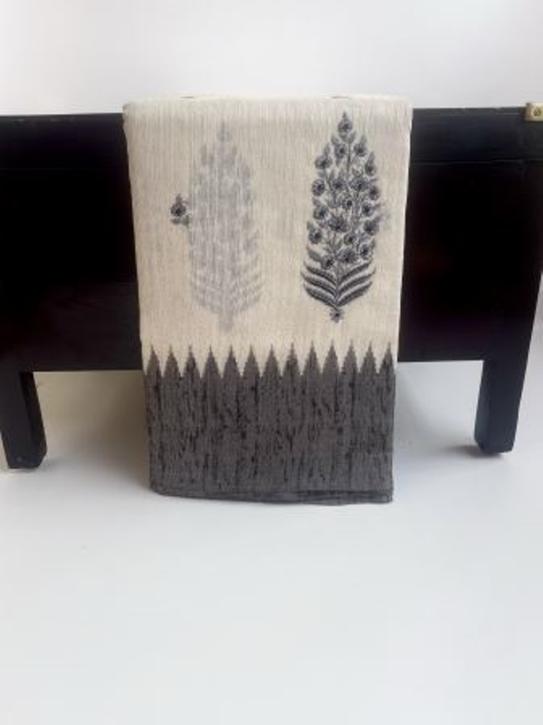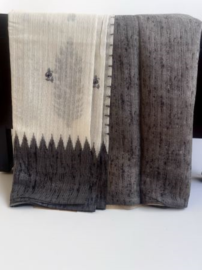 Beige and grey linen slub saree with embrroidery and unstitched blouse