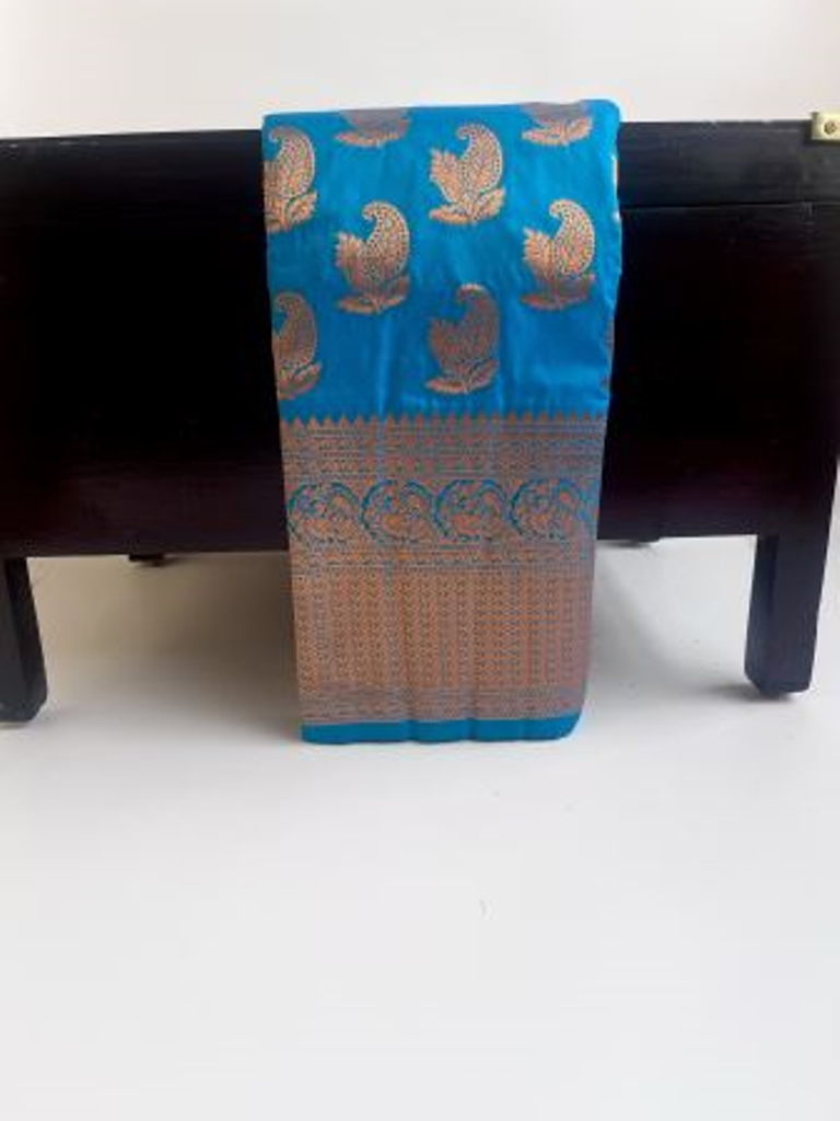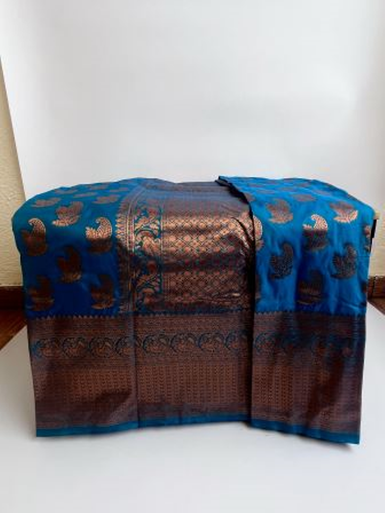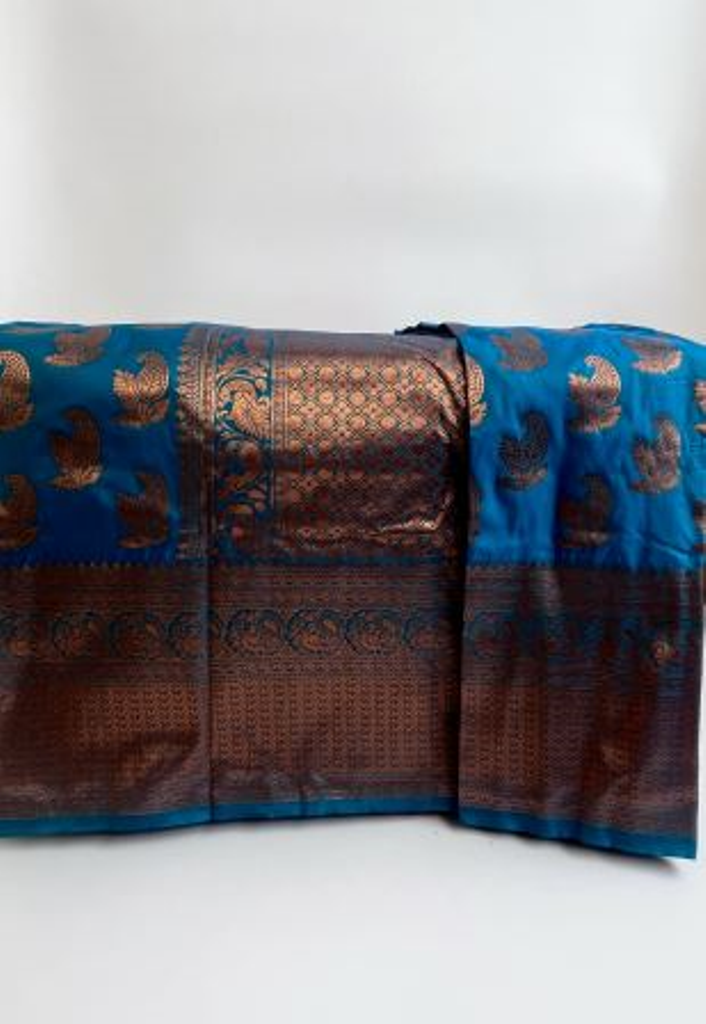 Bondi blue color Banaras print silk blend saree with unstitched blouse