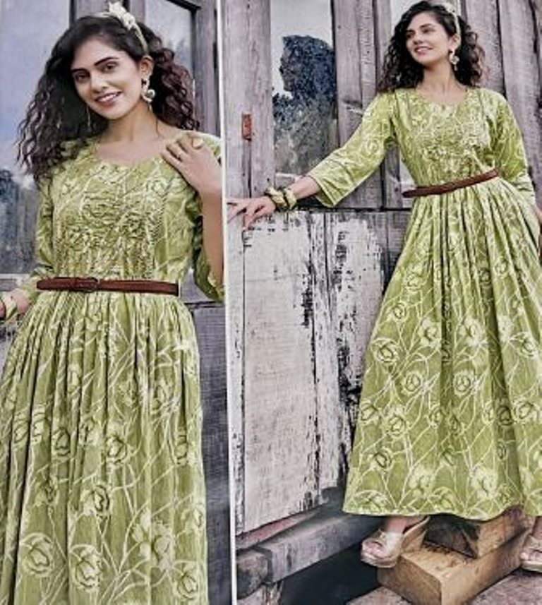 Green Color cotton gown kurti with belt