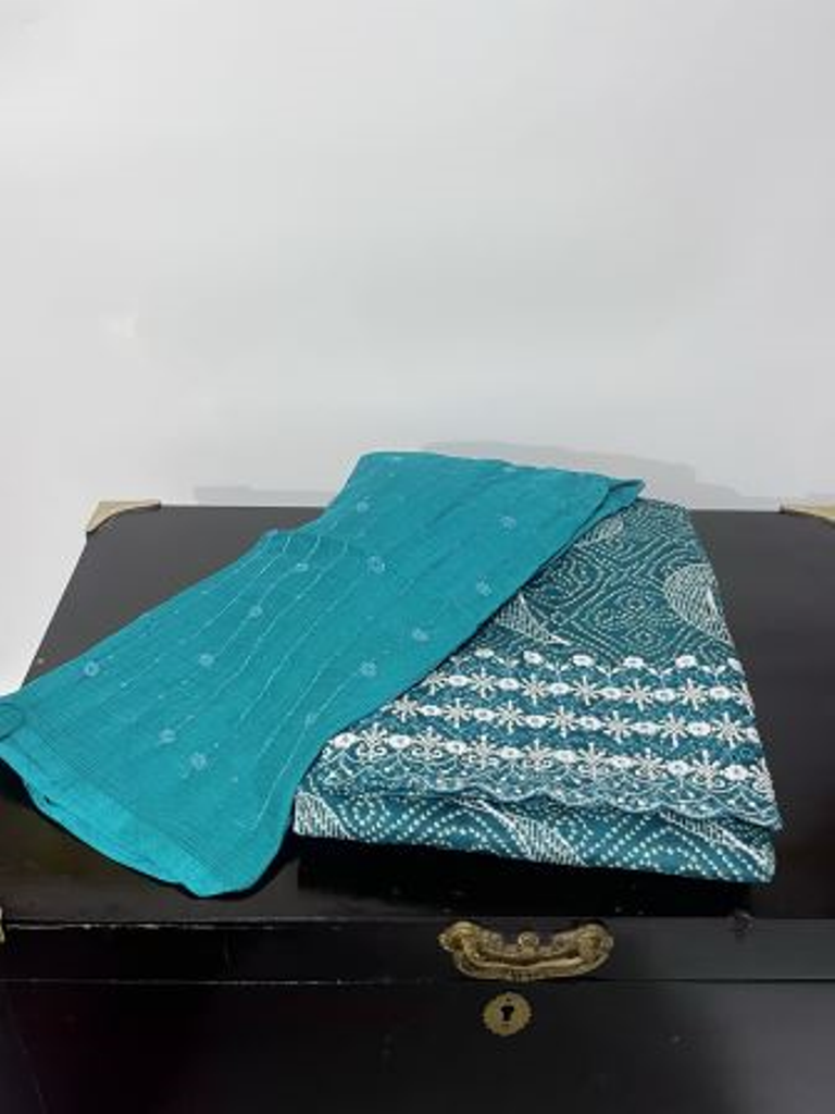 Green colour unstitched cjamsatin suit set with chiffon dupatta