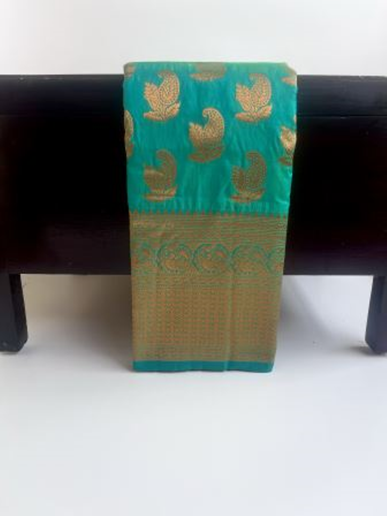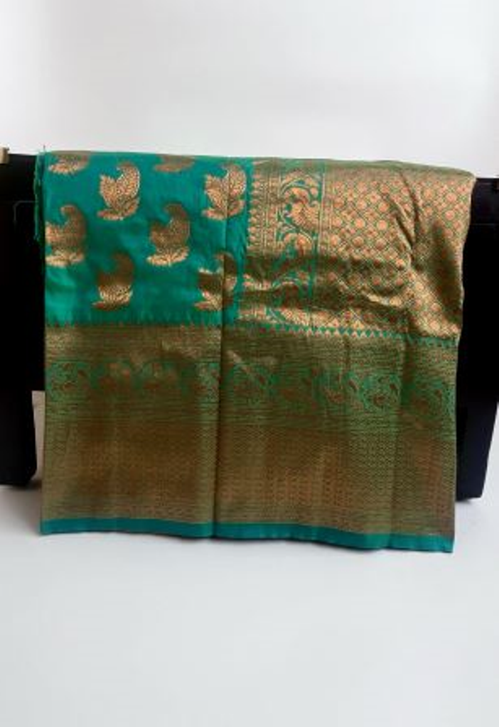 Jade green color Banaras print silk blend saree with unstitched blouse
