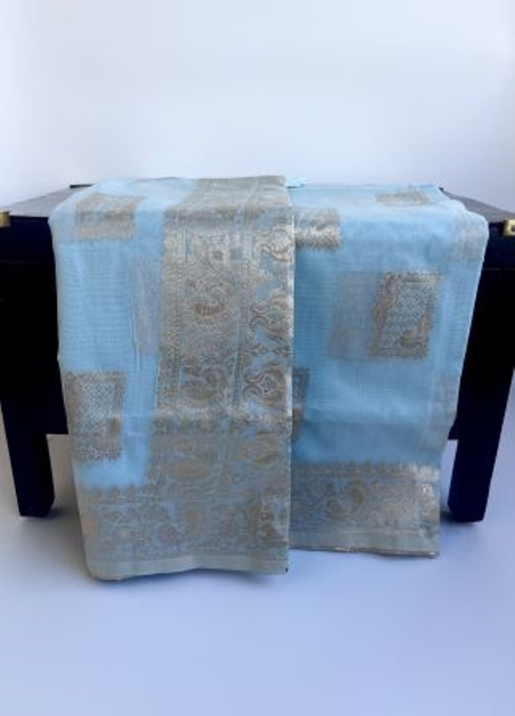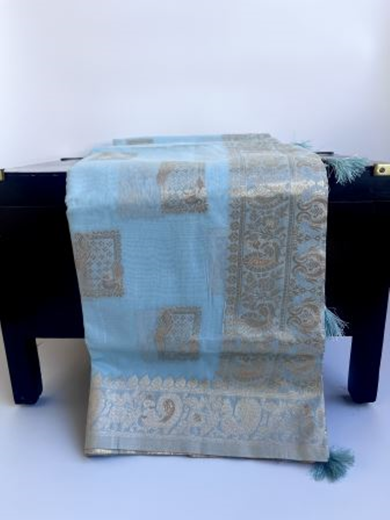 In a tranquil shade of light blue, this tissue blend cotton saree captures the essence of serenity and grace . The delicate fabric drapes softly, enveloping the wearer in a cloud of elegance and comfort. Its soothing hue evokes sense of calmness and tranquility. Accompanied by an unstitched blouse, this ensemble offers versatility for personalized styling.