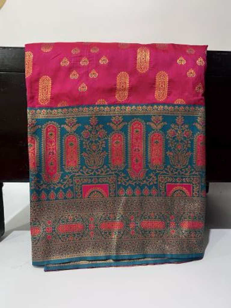 Rani Pink Color Silk blend saree with blue border and unstitched blouse