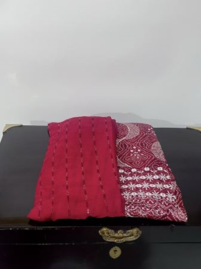 Red colour unstitched jamsatin suit set with chiffon dupatta