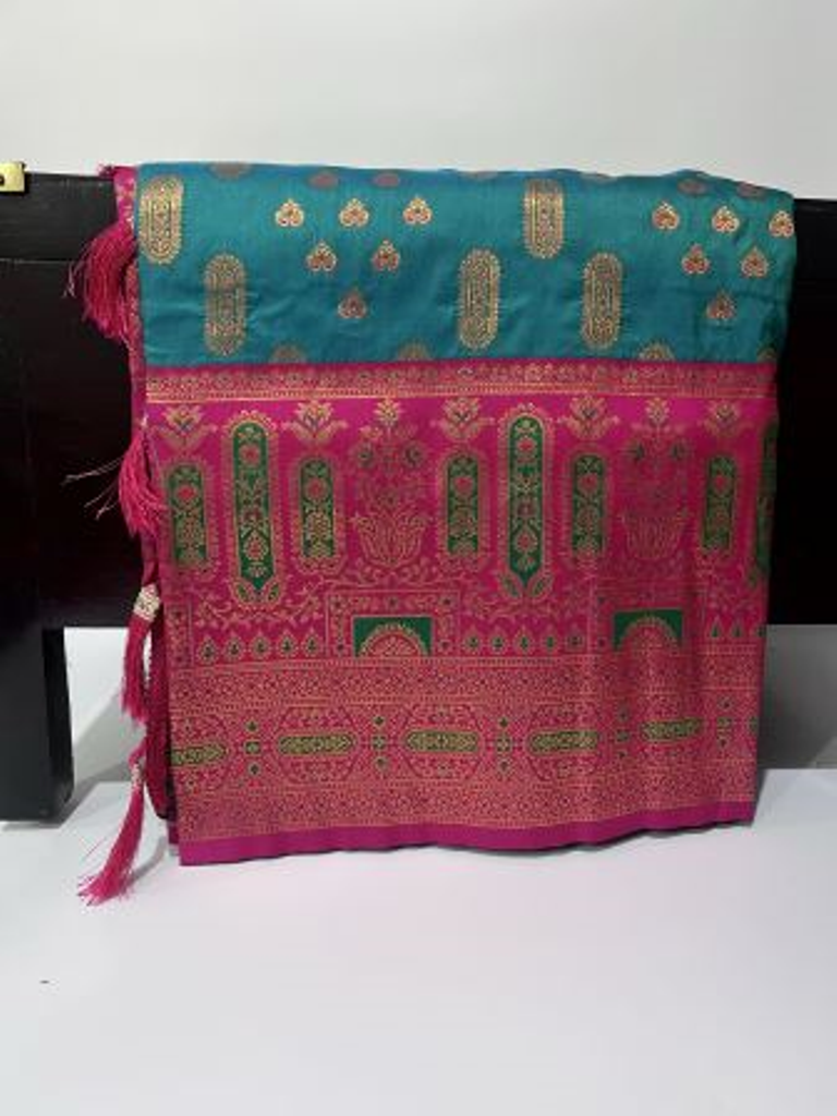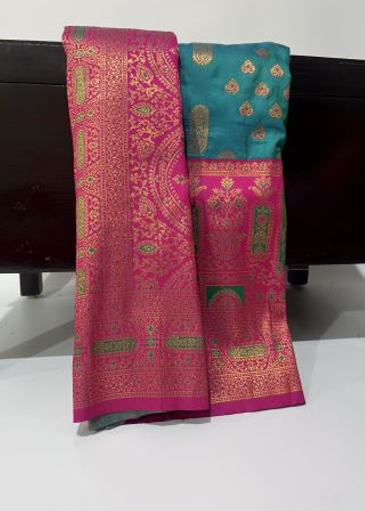 Teal green color silk blend saree with rani pink border and unstiched blouse