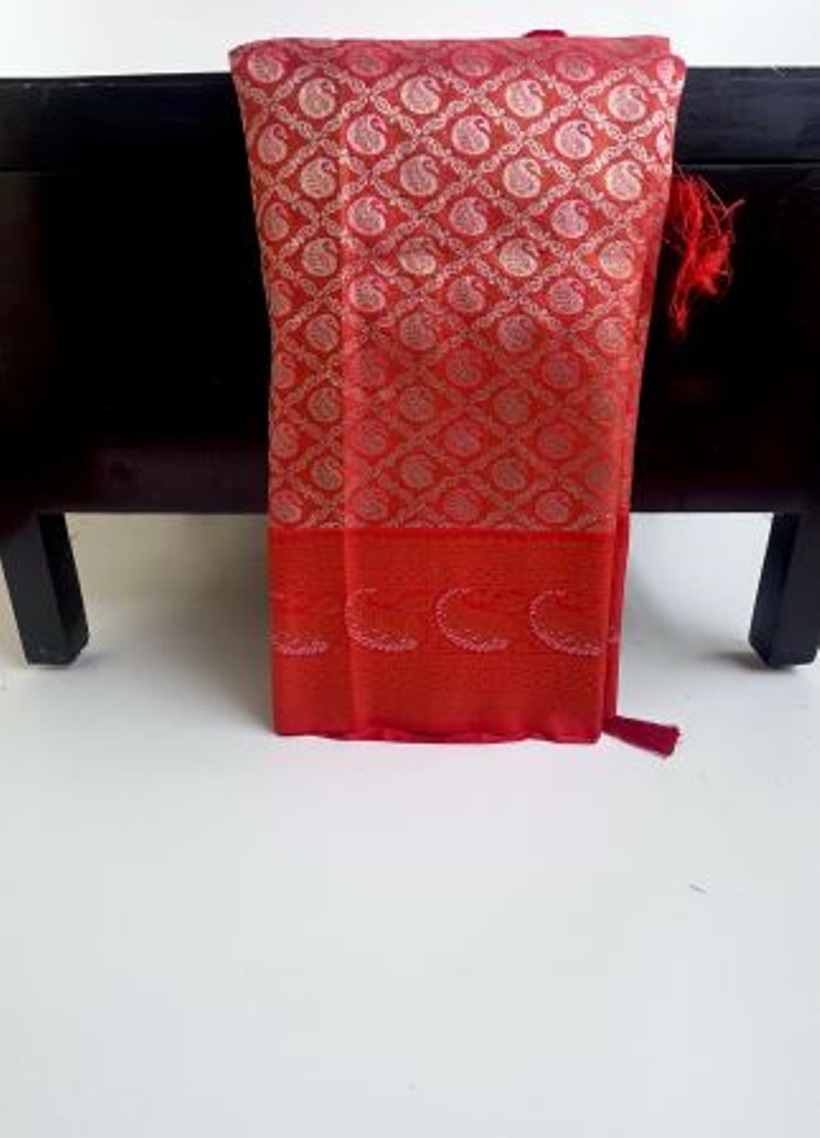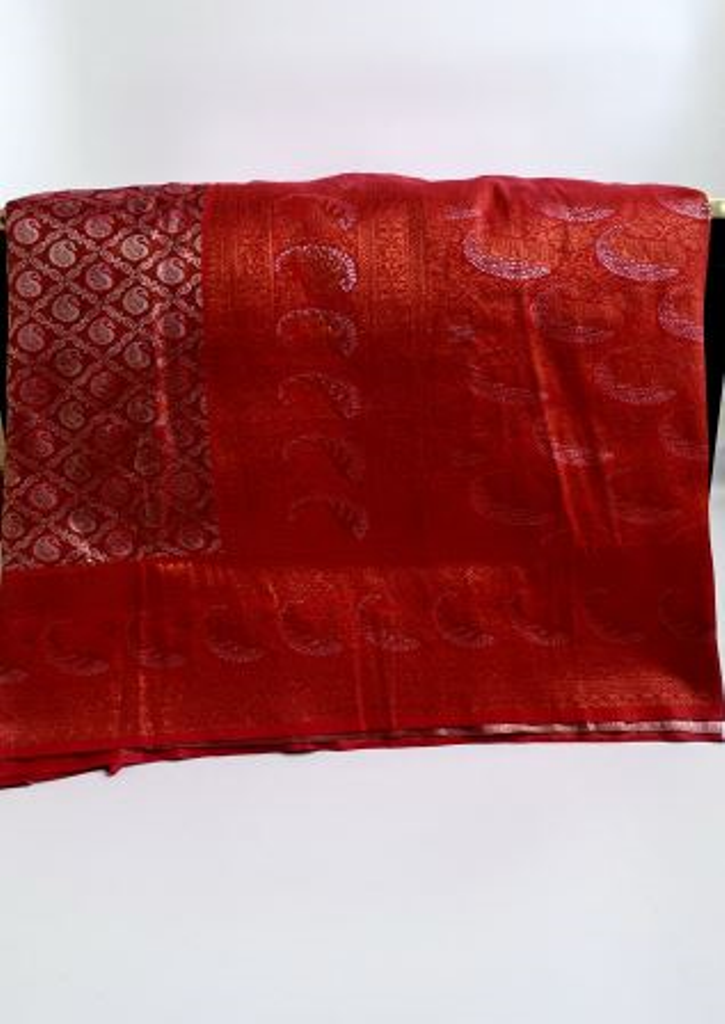 Elegance meets vibrancy in this stunning vermillion synthetic silk saree exuding timeless charm with its rich hue. The luxurious fabric boasts a subtle sheen, adding a touch of opulence to any occasion. Paired with an unstitched blouse, this ensemble offers versatility and customization to suite your style.