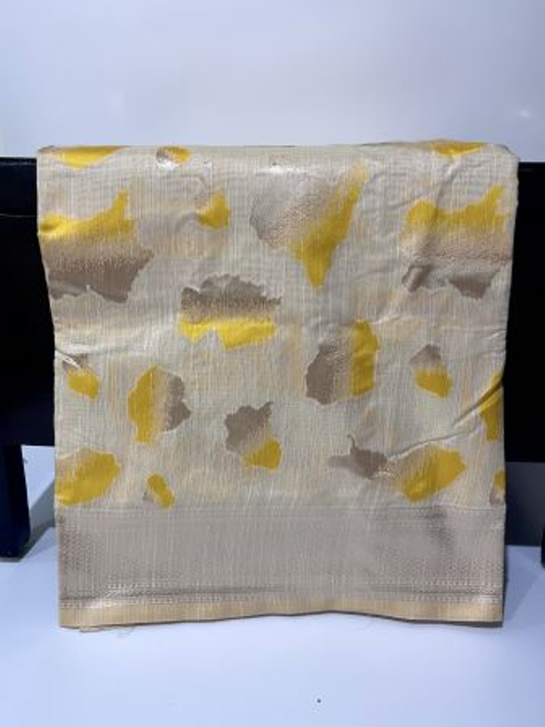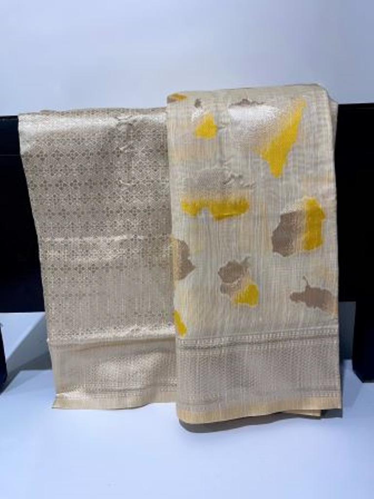 Yellow and beige color linen blend cotton saree with unstitched blouse