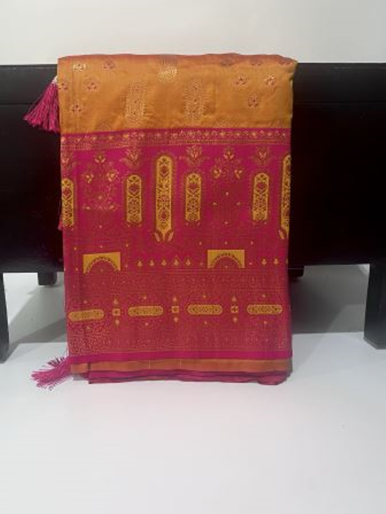 Yellow color silk blend saree with rani pink border and unstitched blouse